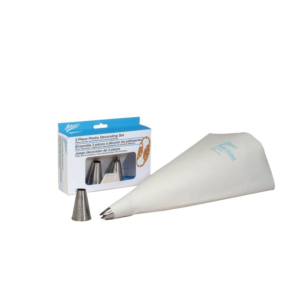 The Ateco Extra Wide Pastry Decorating Tip Set includes an #824 star, #806 plain pastry tube tip and 12" plastic coated pastry bag that makes it easy to add patterned icing to cakes, cupcakes, pies, and more. Made of durable stainless steel, these decorating tips are rust-resistant and designed to withstand repeated use without bending out of shape. Includes multilingual instructions and recipes.