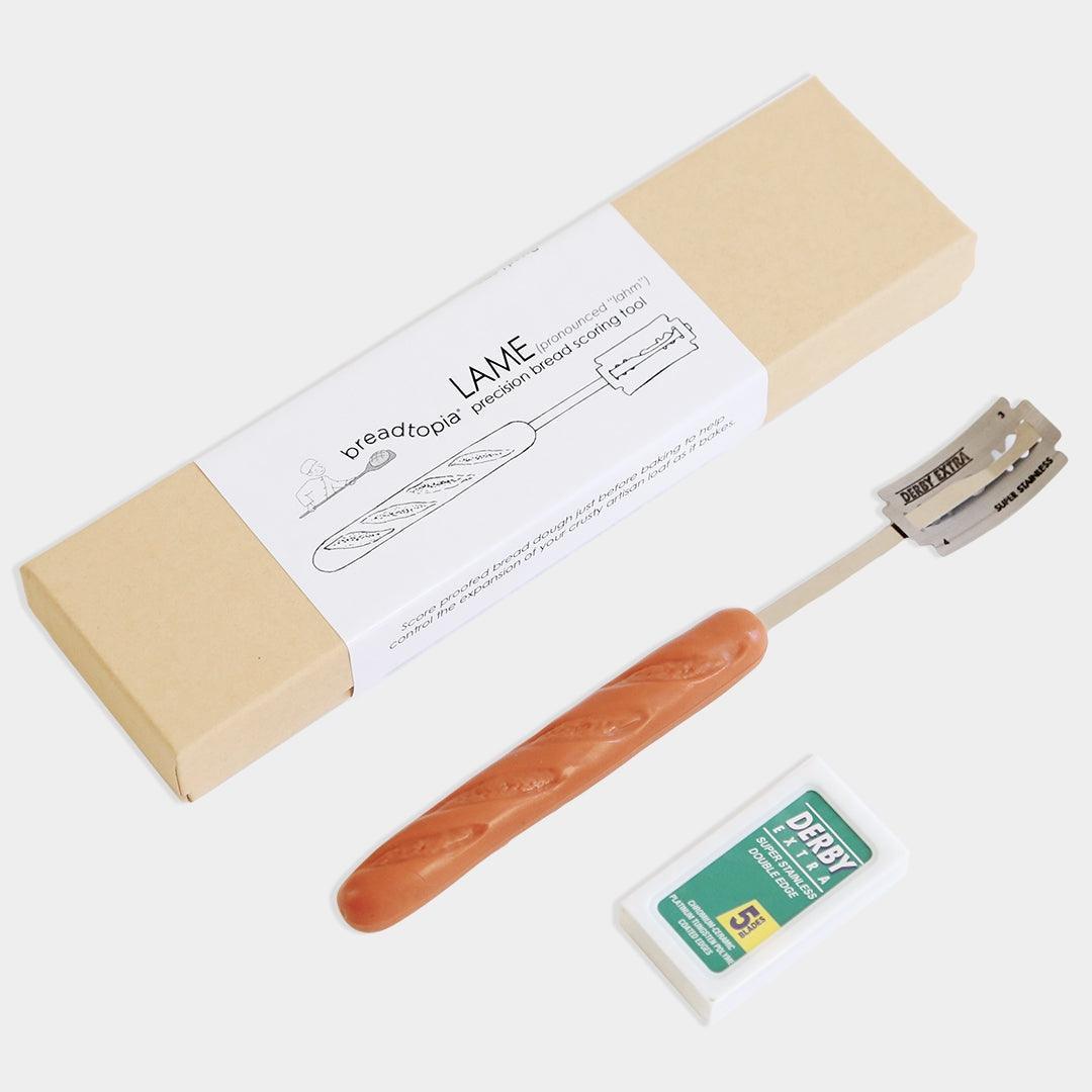 A Lame (pronounced LAHM, meaning “blade” in French) is typically a long thin stick made to hold a metal razor used to cut, or score, bread dough to help control the expansion of the loaf as it bakes.