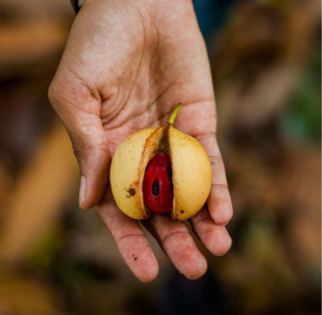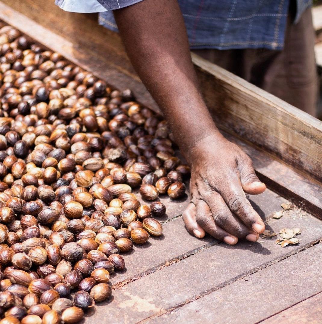 Our nutmeg comes from a small family farm in the hills, run for generations by the Ramdhanny family. They reached out to us via social media (you might be surprised at how often we meet spice farmers on Instagram and Facebook!) in early 2020, and we were thrilled to hear from them. It didn't take long to realize we were aligned on our (very high) quality standards and shared values around sustainable agricultural techniques.
