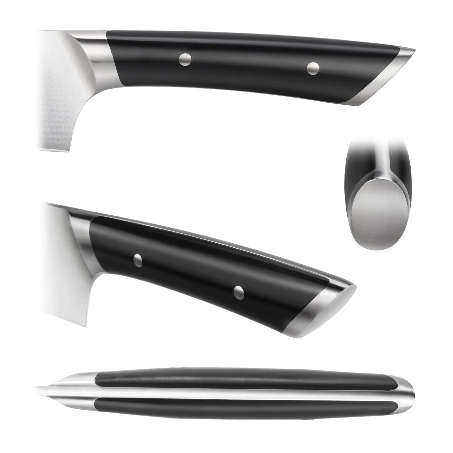 The HELENA Series is an elegantly minimalist interpretation of the modern kitchen knife. A slim, semi-bolster perfectly balances the knife's full tang while complementing the sleek, smooth lines of the handle. Two stain-resistant steel rivets solidly fasten the ergonomic handle to the blade, providing a secure, comfortable grip. Every blade is forged from high-alloy German X50CrMoV15 steel and meticulously heat treated, ensuring a razor-sharp edge with exceptional durability and edge retention.