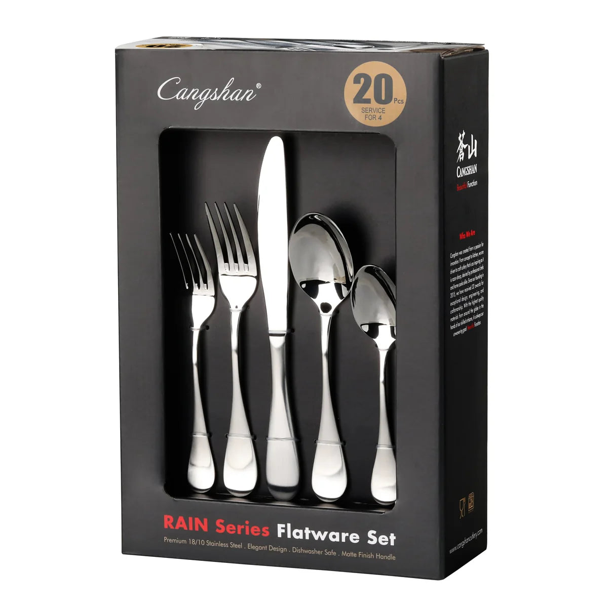 Cangshan RAIN Series, distinguished by clean and simple lines, offers a stylish assortment of sets to instantly refresh your table settings with both classic and striking contemporary styles. Made from high quality 18/10 stainless steel, all Cangshan flatware is designed for both beauty and durability.