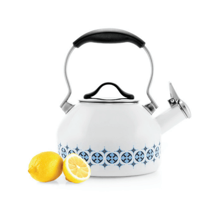 The new Talavera teakettle from Chantal features a beautiful vintage pattern reminiscent of Italian tiles. Enamel-on-steel inside and out with a stay cool black phenolic handle, a single tone whistle and a wide opening for easy fill and cleaning. 1.8-qt.