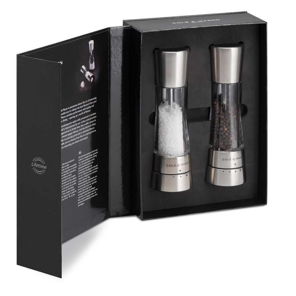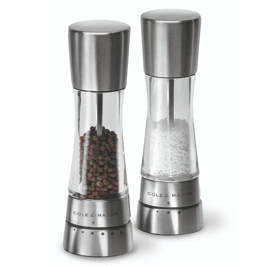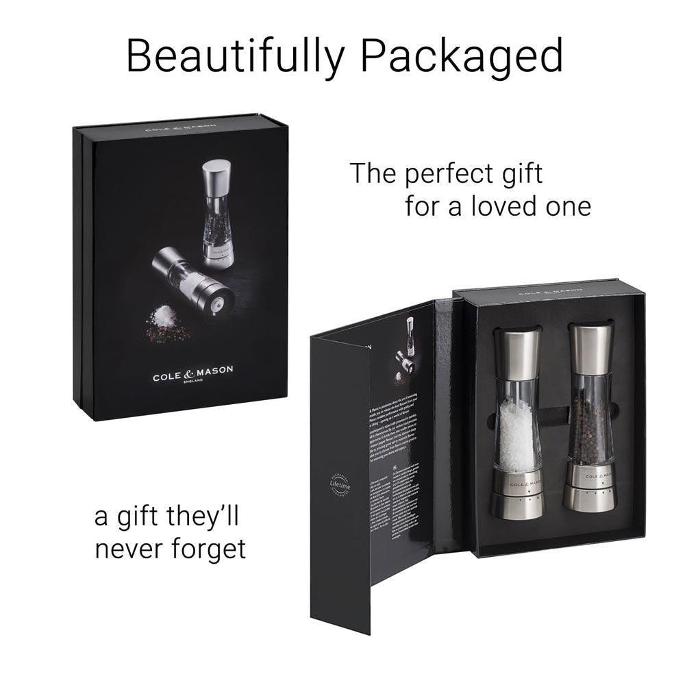 The Cole & Mason Derwent Stainless Steel Salt & Pepper Gift Set makes a terrific wedding, holiday or house warming gift. Style, durability and dependability have been built into every Cole & Mason product since 1919. Using the best materials and mechanisms, our products have been praised by professional cooks and homemakers ever since. You can count on Cole & Mason to give your kitchen table salt and pepper grinder set a touch of class!