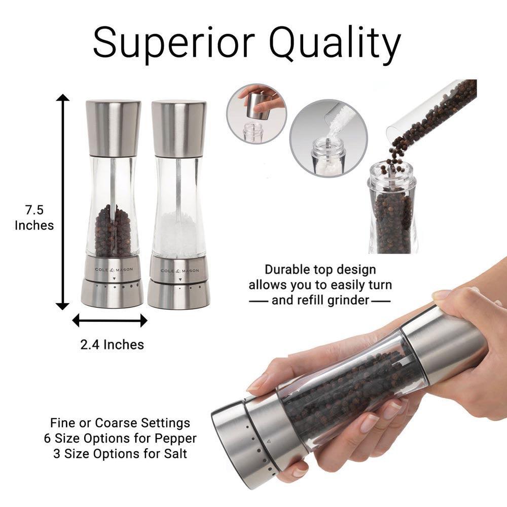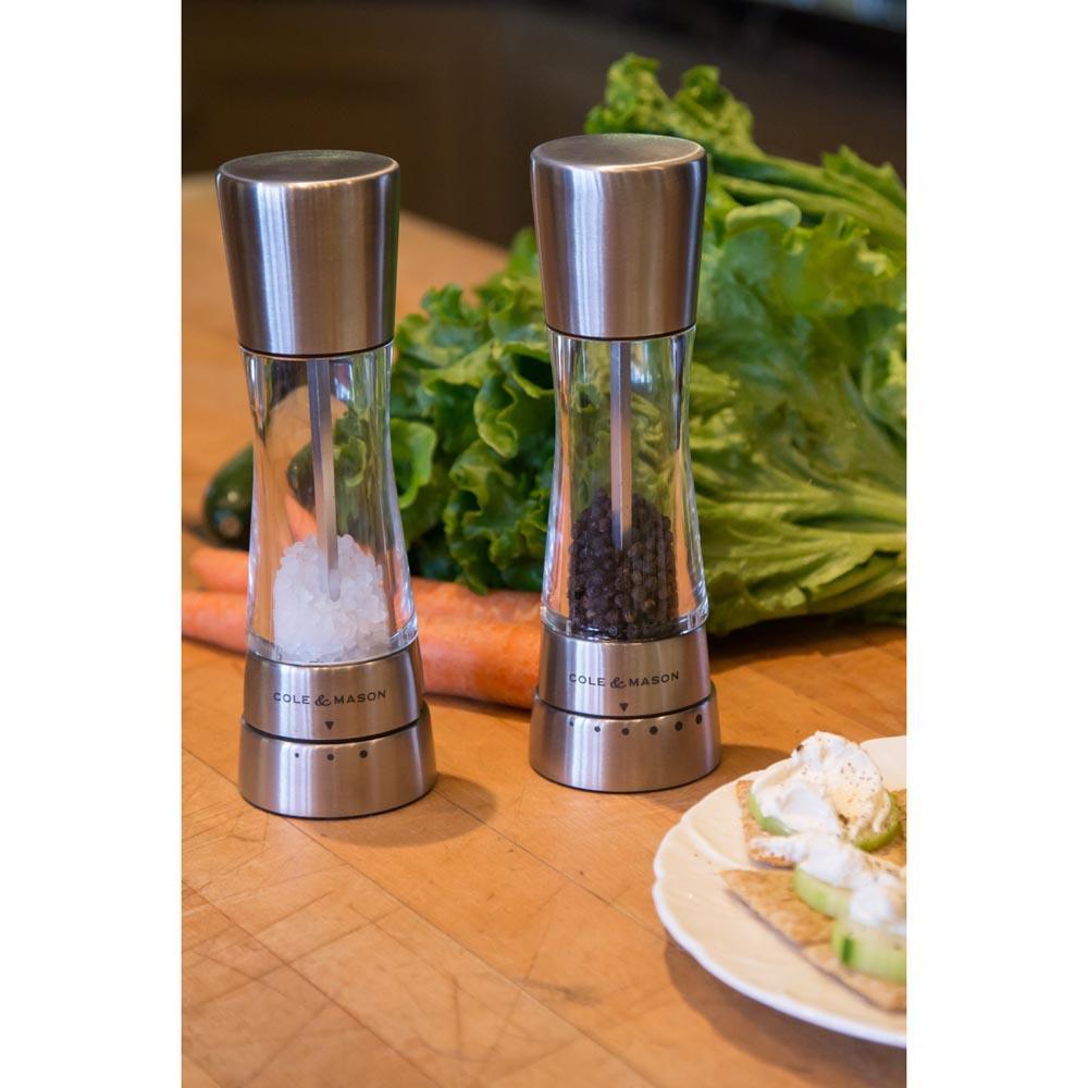 Cole & Mason 7.5 in. Derwent Stainless Steel Gourmet Salt and Pepper Mills introduce a visually stunning style to your table with a sleek acrylic hourglass fastened by stainless steel. From fine powders to coarsely sliced and ground gourmet chunks, Derwent Pepper Mills use premium hardened carbon steel millworks to bring user-friendly spice control to your table with six distinct settings. Simply twist the collar on the Derwent Stainless Steel Pepper Mill to 6 pre-selected settings to achieve a fine to coarse grind during and after cooking. Use a coarse grind for steaks, a medium setting for pizzas and a fine setting for soups and sauces. Each pepper mill features a push top cap for easy refilling. The grinding mechanism is guaranteed for life.