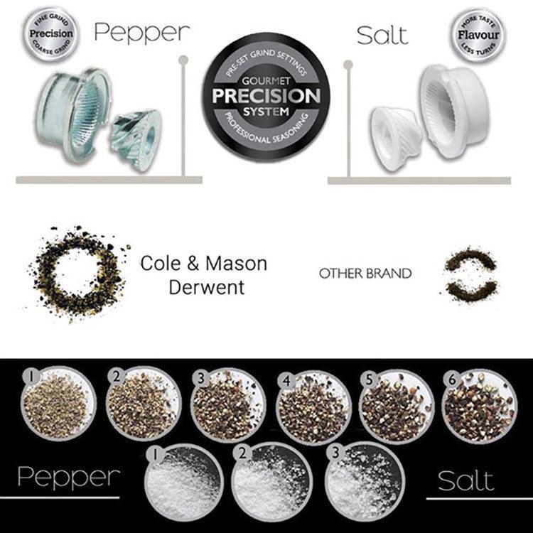 - Lifetime Cole & Mason Mechanism Guarantee: Instead of crushing salt and pepper, the Professional Gourmet Precision Mechanism strips them down by their individual layers as it grinds, releasing maximum flavor