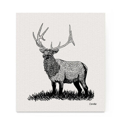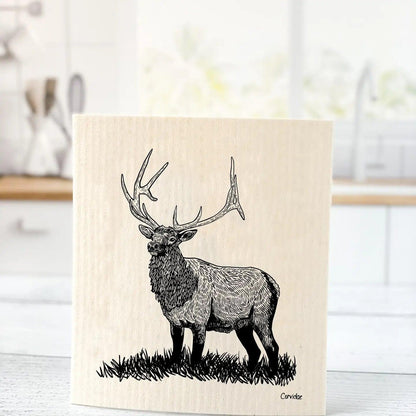 Eco Friendly Compostable Swedish dishcloth that features an illustration of a bull Elk on a grassy hillside.