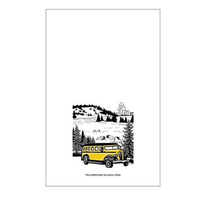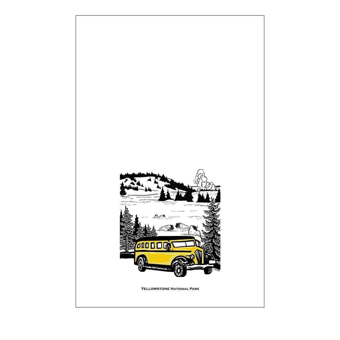 Features a whimsy illustration of a Yellowstone Park Yellow Jammer, bison and erupting geysers.