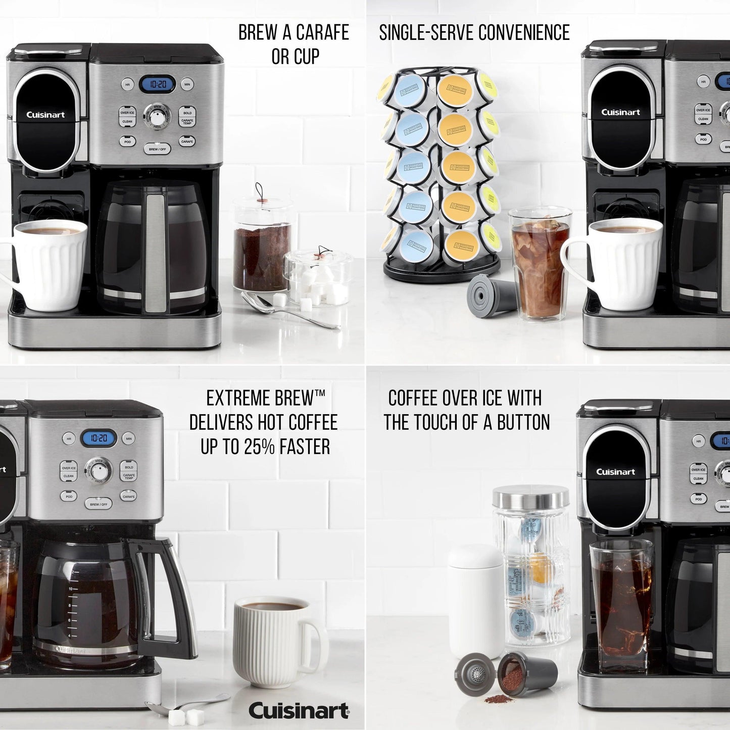 Drip or pod, hot or iced, single cup or carafe for 12—get your coffee, your way with the Cuisinart 2-in-1 Coffeemaker. This kitchen essential for coffee lovers takes home brewing to another level by combining 12-cup carafe and single-serve options in one convenient unit. Brew a full pot 25% faster with Extreme Brew technology. Customize when and how you want your coffee with advanced start, Brew Pause™, temperature control, auto-off, and bold flavor settings. Instantly brew a single serving of hot coffee in 5 cup sizes with any pod, including Keurig K-Cup®, or the reusable HomeBarista™ filter. Or brew over ice for delicious coffee that refreshes! Experience complete brewing versatility and customizable convenience, courtesy of Cuisinart!