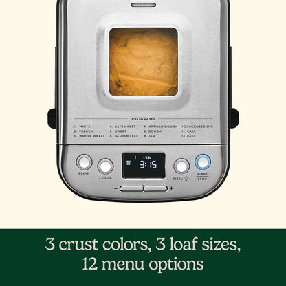 Everybody loves homemade bread, but not everybody has time to make it. Let Cuisinart® do it for you! This versatile and compact automatic bread maker offers a variety of crust colors and loaf sizes, as well as 12 preprogrammed menu options. Foolproof recipes include everything from gluten-free and artisan breads to jams and sauces. With a convenient 13-hour delay-start timer, that wonderful aroma of just-baked bread can be waiting for you when you wake up.