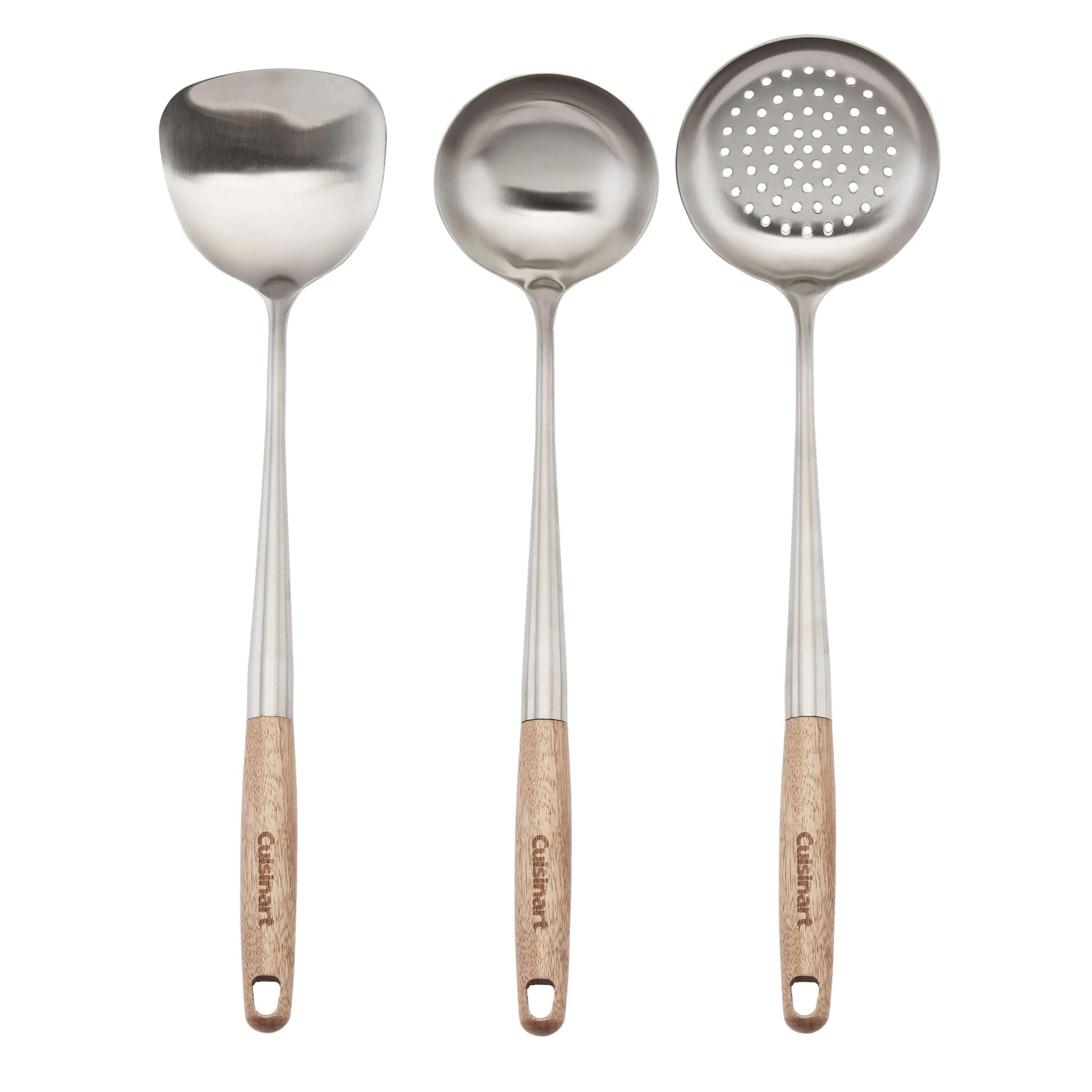 Stir fry and sauté delicious hot meals using the trio of essential utensils made specially for wok cooking. The stainless steel turner, skimmer, and ladle have handles topped with smooth acacia wood for a solid hold, so mixing meals is quick, safe, and controlled with ease. Contoured tool heads are made to move food around the curved walls of the wok, while the extra-long handles keep hands and arms at a safe distance from hot splatter. The sleek wood and metal design complements the modern kitchen. Crafted with a hole on the end of each handle for easy hanging, these premium tools are perfect for displaying between uses.