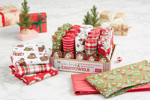 Each dishtowel is folded into thirds and rolled. Each dishtowel is tied with a to/from gift tag.