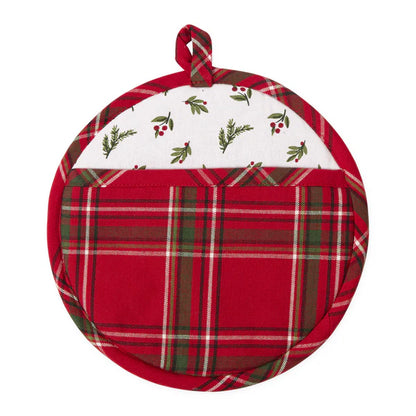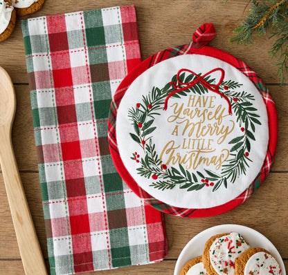 Set includes 1 plaid dishtowel folded inside an embellished potholder