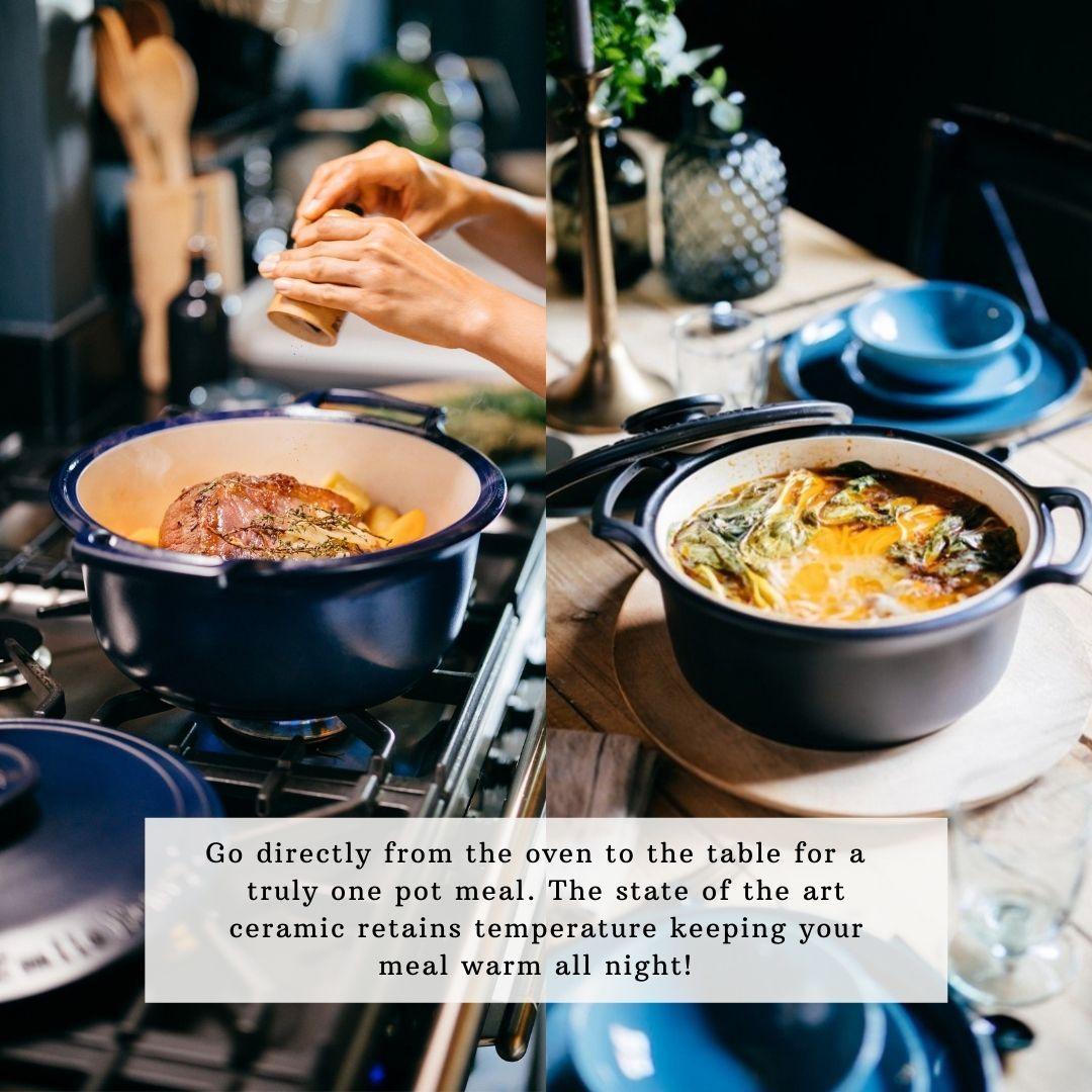 In common use, sublime is an adjective meaning "awe-inspiringly grand”, like the best chocolate fudge sundae you've ever had. The result of extensive research, ‘Sublime’ ceramic makes it possible to create and serve all kinds of recipes—with unparalleled ease of use. Sublime is made from a new ceramic technology designed to do all kinds of cooking and to do it better than other materials. You could feasibly own just one pot to make all your meals. What makes this technology so remarkable is its versatility. It can handle the high heat of searing, frying or barbecuing on the grill and also softly cook on low heat so that sugars in a caramel sauce or a custard are gently heated without burning or over cooking. The Sublime ceramic distributes heat smoothly across the whole pot better than any metal, including cast iron or stainless steel and it is 35% lighter than those other materials.