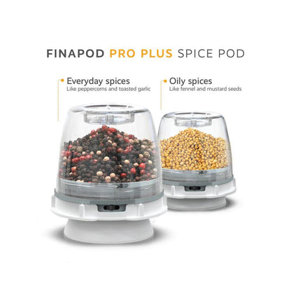 The FinaMill Everyday Pod is perfect for grinding: Cacao nibs, Cardamom seeds, Celery seeds, Chipotle sea salt, Coriander seed, Cumin seed, Dill seed, Fennel seeds, Ginger - dried and minced, Grains of Paradise, Hawaiian pink sea salt, Hemp seeds, Himalayan pink salt, Montreal seasoning, Mustard seeds, Peppercorns - green, pink, white, Sichuan, Sea salt, Sesame seeds, Sunflower seeds, Tellicherry peppercorns, Toasted garlic, Toasted onion.