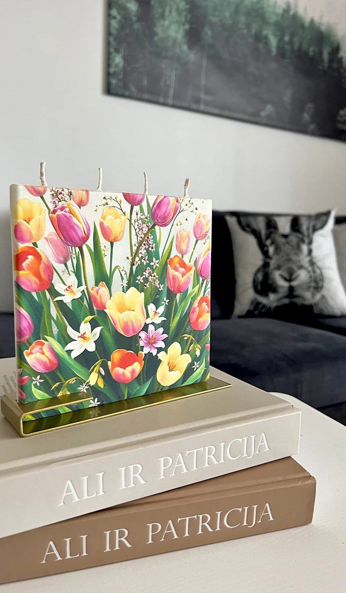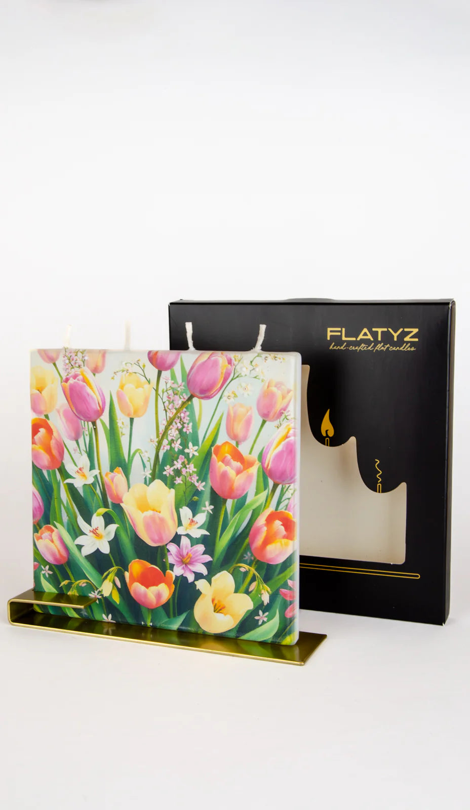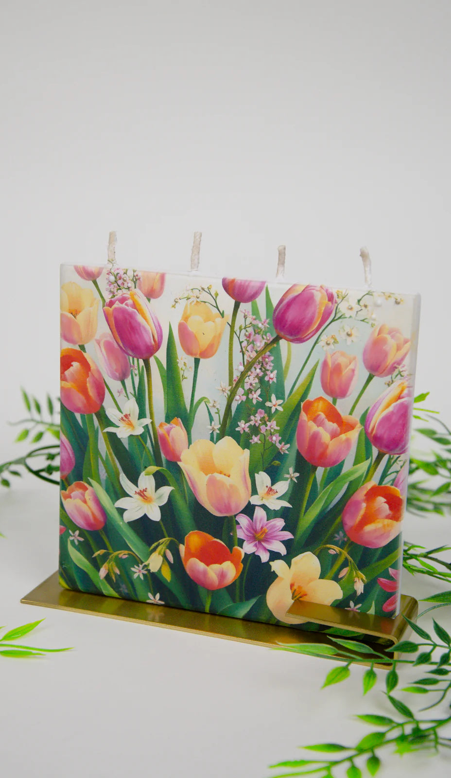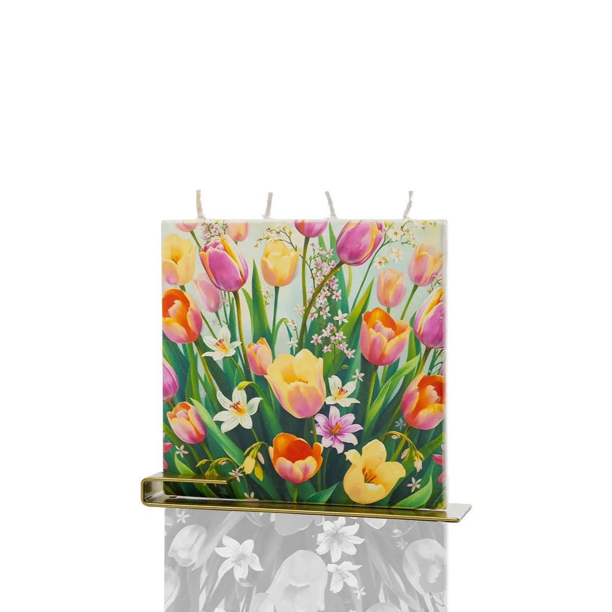 Celebrate the vibrant beauty of spring with this flat-shaped hand-crafted and hand-painted candle, featuring a cheerful design of tulips and blooming flowers. This delightful candle brings the freshness of a spring garden into your home, making it a perfect addition to any space.