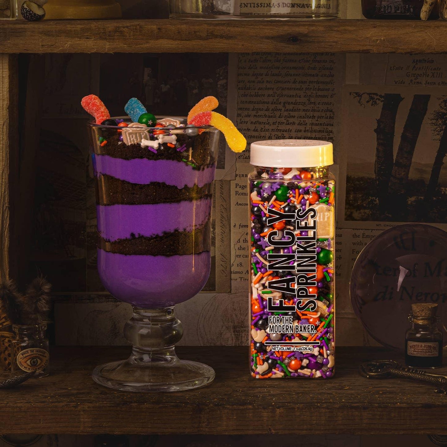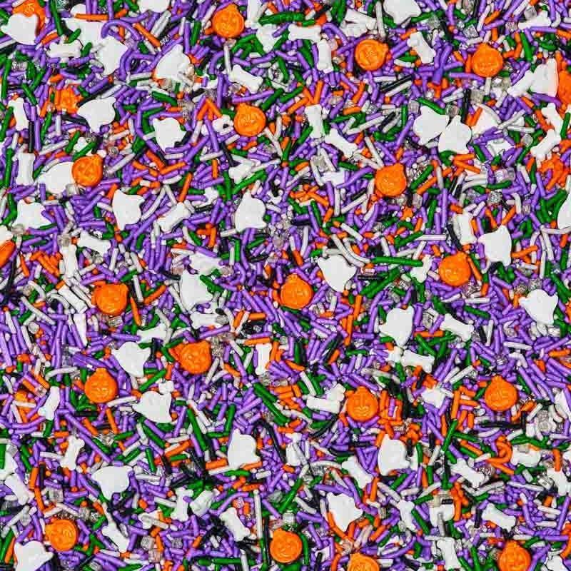 The art of dying. Haunted Mansion is a mortal mix of purple, orange, green, black, and white jimmies, sixlets, candy pearls, gravestones, mini bones, ghosts, stars, and bats buried beneath a galaxy of mini edible silver glitter stars. Mark our words (and our gravestones), you only live once.