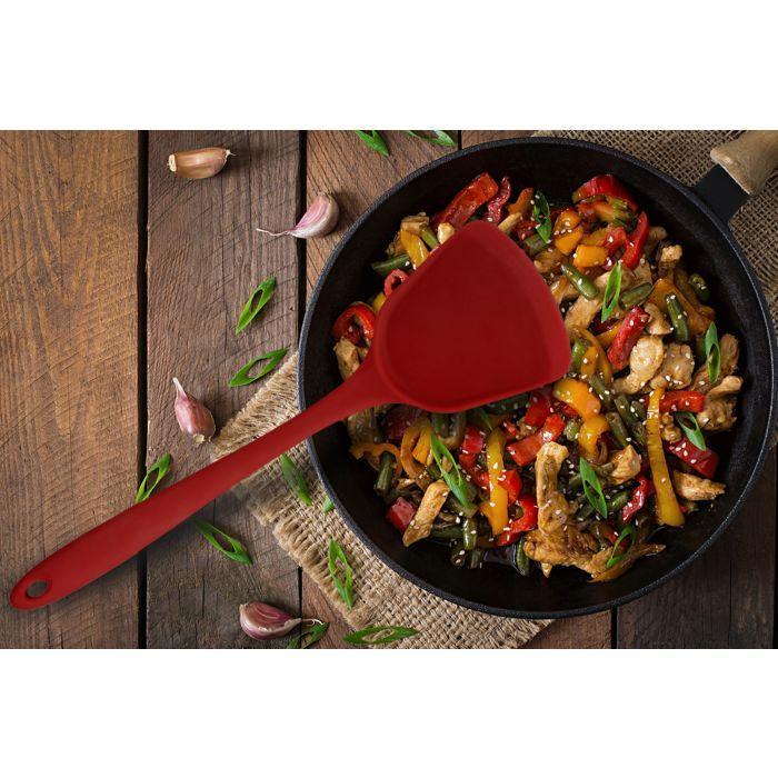Helen's Asian Kitchen Silicone Wok Turner makes wok cooking and food preparation a breeze! Whether stirring, mixing, dividing, tasting, or turning foods, it?s designed to speed up everyday wok cooking tasks. A useful addition to kitchen utensils, whip up everything from a snack to an evening meal and holiday meals. Safe for use on nonstick cookware, the silicone won't scratch surfaces or remove the seasoned surface from steel woks, known as patina, which helps give them their natural non-stick quality. Perfect cooking tool for everyone, even families with budding young chefs just learning to cook. Great for stir frying, too! Stores away easily in a kitchen gadget drawer and looks great in a utensil holder on the counter, always at the ready. Made from FDA-approved, non-stick silicone, Helen Chen's Wok Turner is strong and durable. Proposition 65 compliant. Safe for use on nonstick cookware and metal pots and pans. Long handle keeps hands safe from heat. Dishwasher safe for easy cleanup.