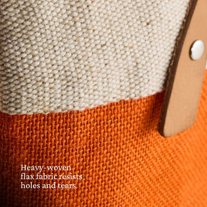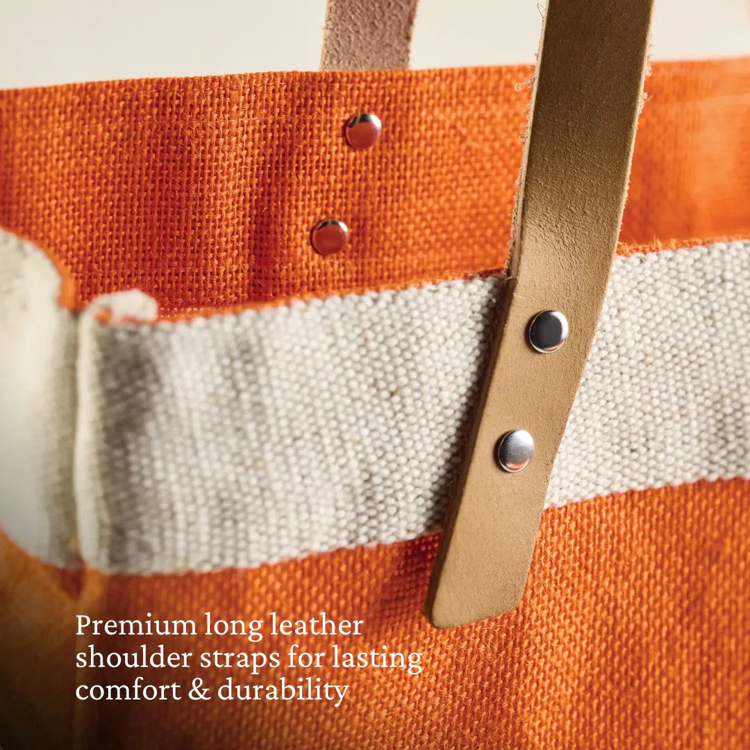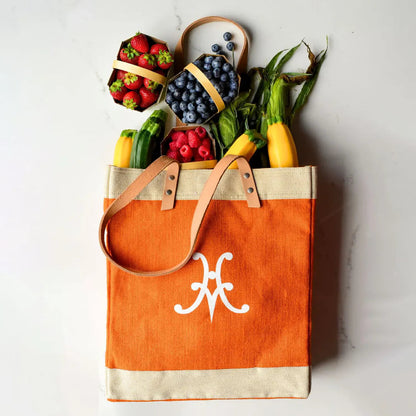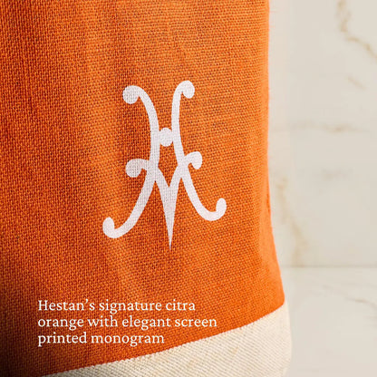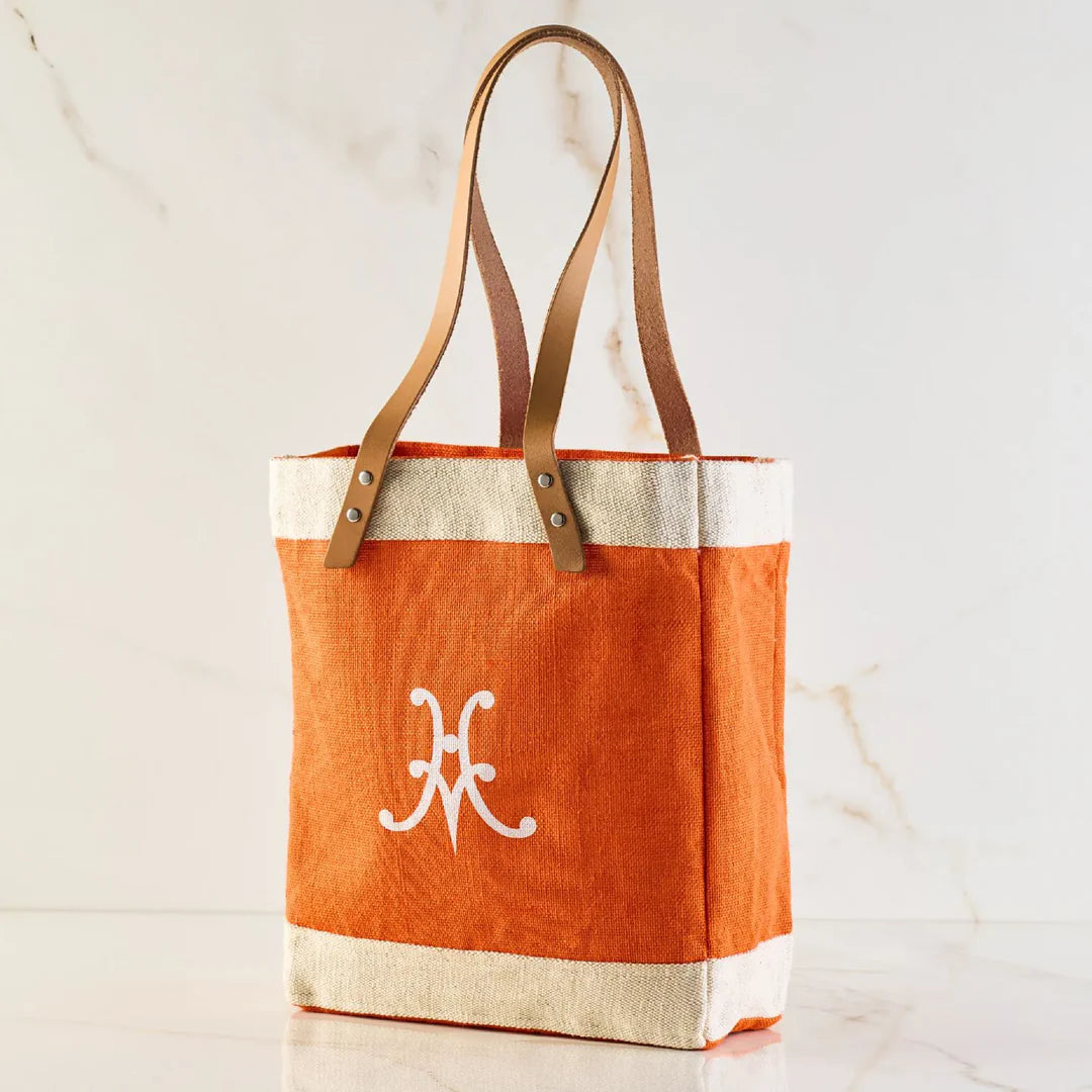 Stylish woven flax market tote with long leather handles, waterproof interior and inside pocket, and Hestan monogram in their signature Citra orange.