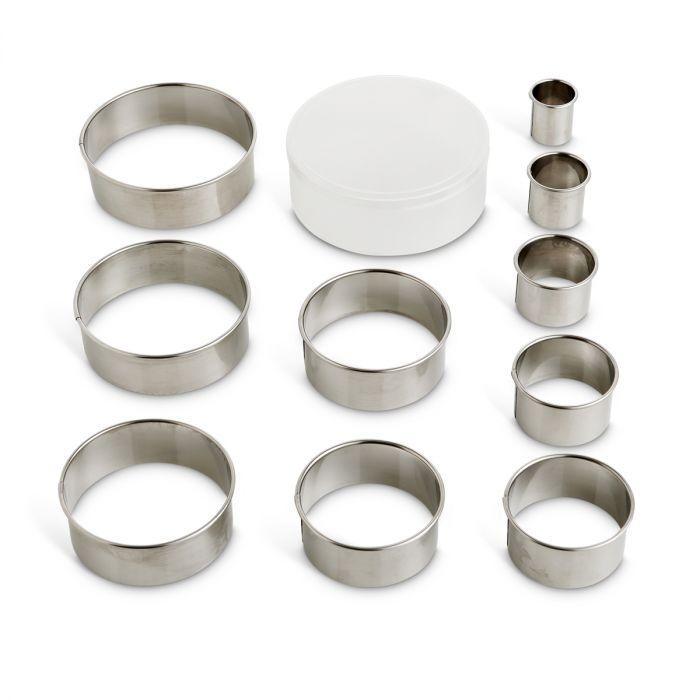 - Made from stainless steel; includes 10 graduated cutters (1, 1.5, 1.75, 2, 2.5, 2.75, 3, 3.25, 3.5, 3.75-inch x 1-inch) and reusable storage container
