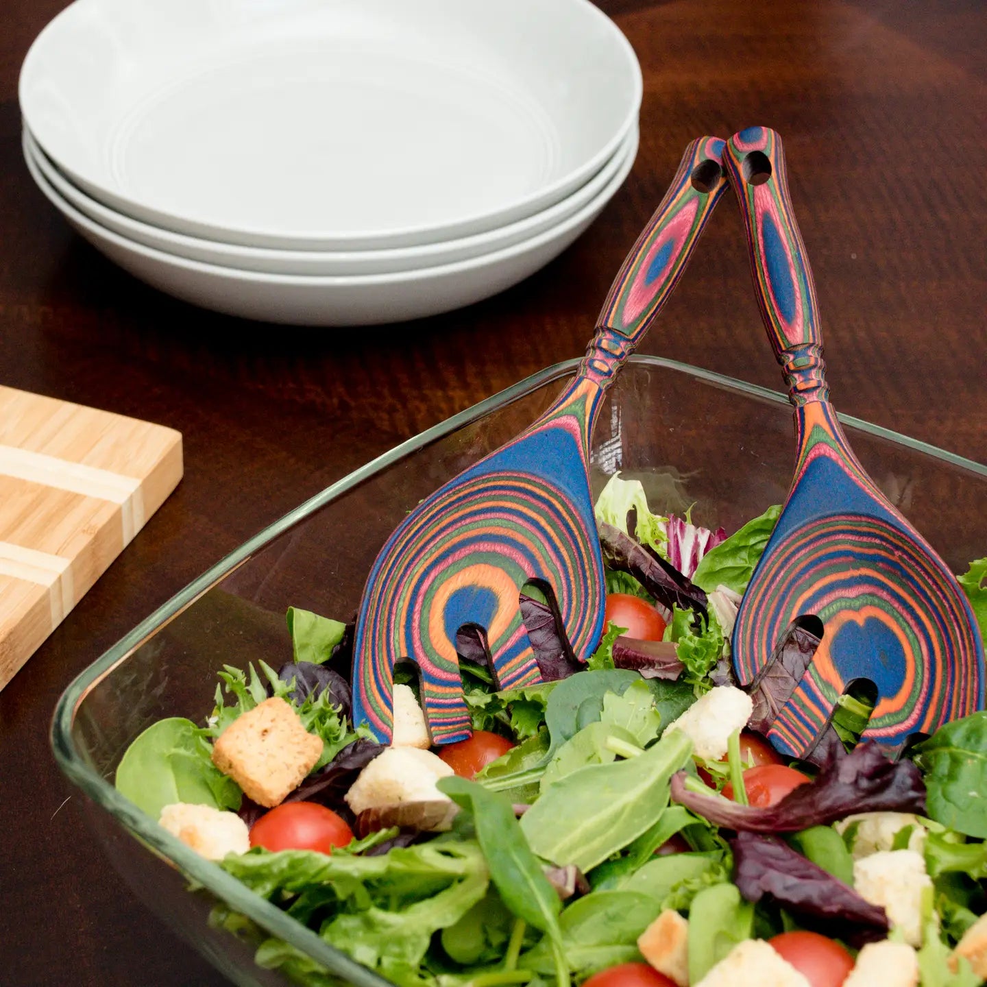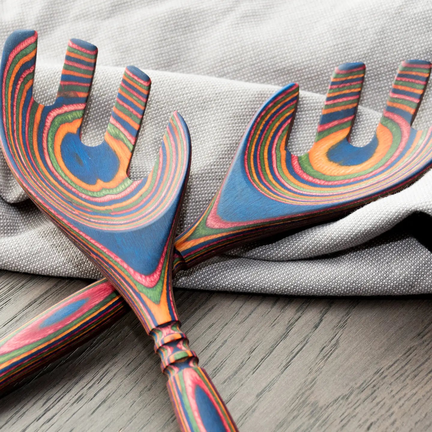 These wood utensils are made with 100% pakka wood. Layers of food safe, colored material make up these unique wood kitchen tools.