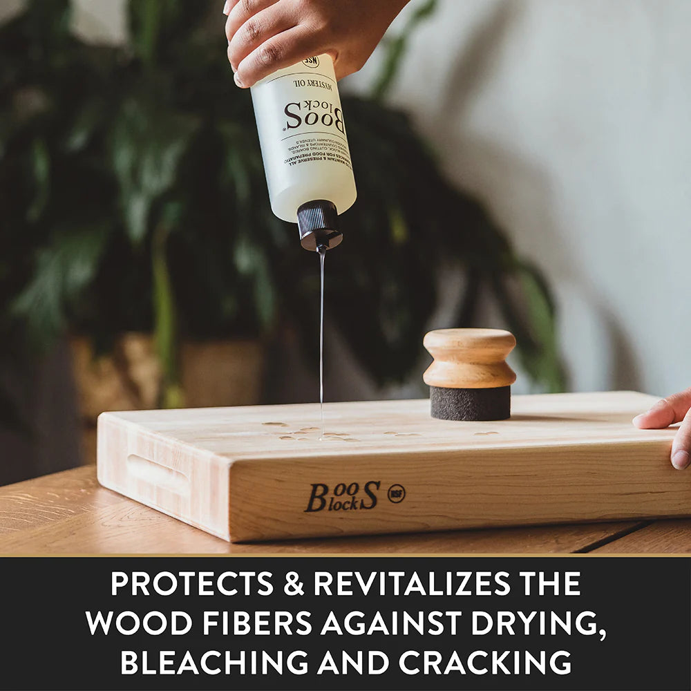 Boos Block Mystery Oil contains all natural food safe ingredients. The food-grade oil penetrates deep into the grains of the wood to protect and revitalize the wood fibers. Apply a generous amount and letting it sit overnight, will help reduce dryness to your wood surface. Wipe off any excess in the morning. Do not over oil your wood products.