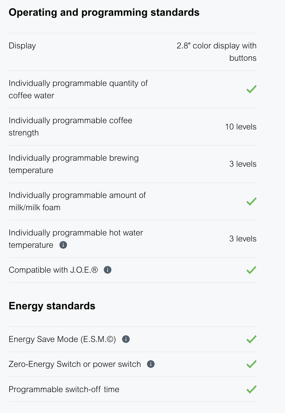The clearly presented 2.8" color display, six ideally placed buttons and an intuitive operating concept enable convenient operation of the E6, whether you want simple coffee preparation, to set individual preferences or use the self-explanatory cleaning functions. The E6 is also compatible with J.O.E.®, which allows you to prepare specialty coffees, set and store personal preferences and easily send your guests' coffee orders directly to the coffee machine from your smartphone.