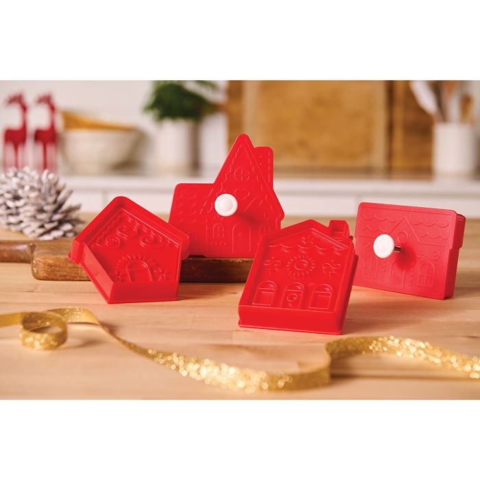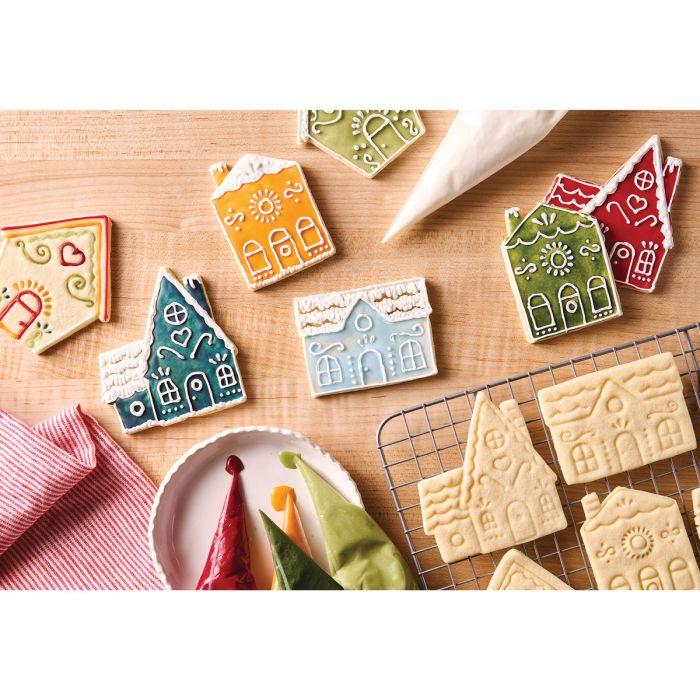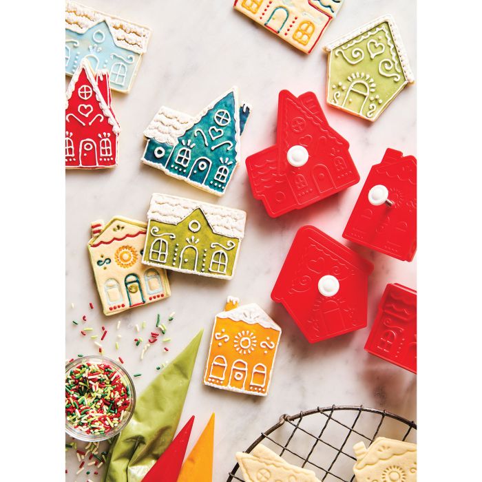 - King Arthur Baking Company's Holiday Village Pop-Out Cookie Cutters stamps embossed house-shaped cookies for festive treats and entertaining