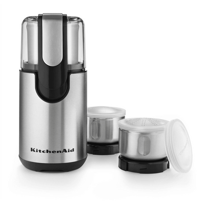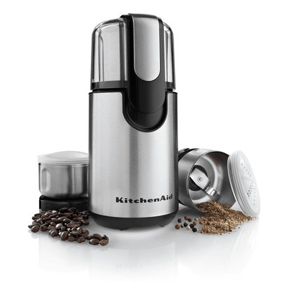 Grind whole coffee beans or spices, quickly and easily, with the KitchenAid® Coffee and Spice Grinder. The grinder's one-touch operation, on-bowl measurement markings, stainless steel blade and clear cover make grinding whole coffee beans or spices a breeze.
