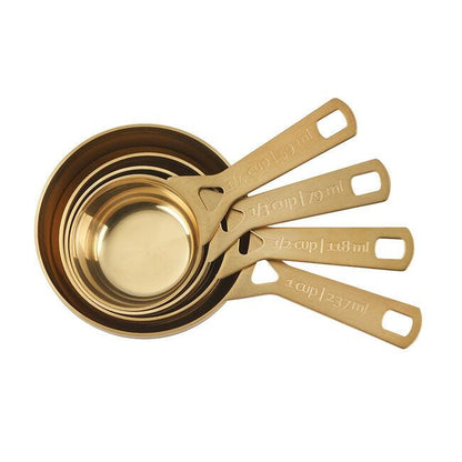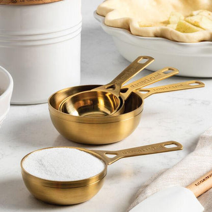 Le Creuset Gold Measuring Cups are a kitchen essential for providing precise measurements while baking and cooking. Featuring the most common recipe sizes, the set is firmly held together with a detachable ring and nest flatly for streamlined storage. The measuring cups are crafted from heavy-gauge and durable stainless steel with an elegant gold finish that is easy to clean and dishwasher-safe.