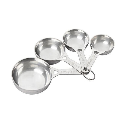 A must-have in any kitchen, these measuring cups give precise measurements for baking and cooking. Made of heavy-gauge stainless steel with a polished and brushed finish, they're also dishwasher-safe. Four cups measure 1/4 cup, 1/3 cup, 1/2 cup, and 1 cup.