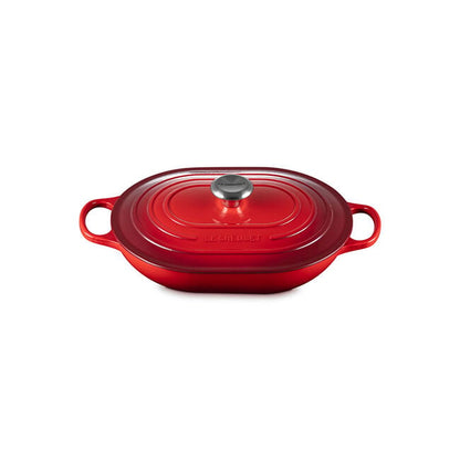 Perfect for sautéing, shallow frying, steaming and serving dishes straight to the table, the enameled cast iron Signature Oval Casserole can handle everything from roasts and whole fish to vegetables and side dishes. The elongated oval shape is ideal for larger cuts of meat, hearty stews and baked casseroles meant to share. The sloped sides and wide cooking surface make stirring and serving a breeze. Use it with the lid as a traditional casserole for family meals, or without as a roaster or buffet dish when entertaining guests.