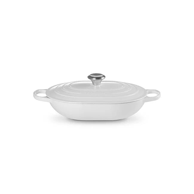 Perfect for sautéing, shallow frying, steaming and serving dishes straight to the table, the enameled cast iron Signature Oval Casserole can handle everything from roasts and whole fish to vegetables and side dishes. The elongated oval shape is ideal for larger cuts of meat, hearty stews and baked casseroles meant to share. The sloped sides and wide cooking surface make stirring and serving a breeze. Use it with the lid as a traditional casserole for family meals, or without as a roaster or buffet dish when entertaining guests.