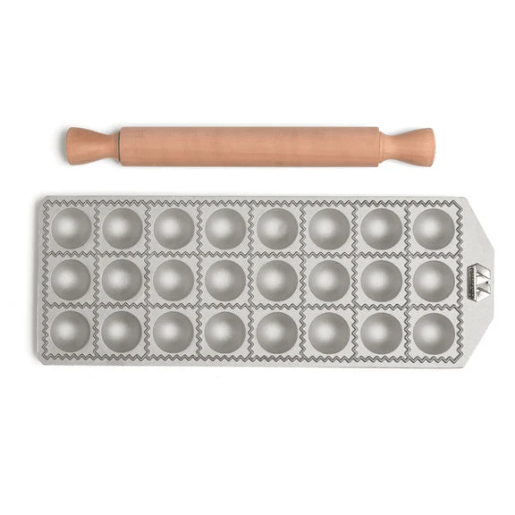 The Marcato classic Ravioli Mold allows you to prepare up 24 ravioli at once. The body of the mould is made of die cast aluminum, a solid food-safe material which guarantee a clean cut of the pasta sheet.