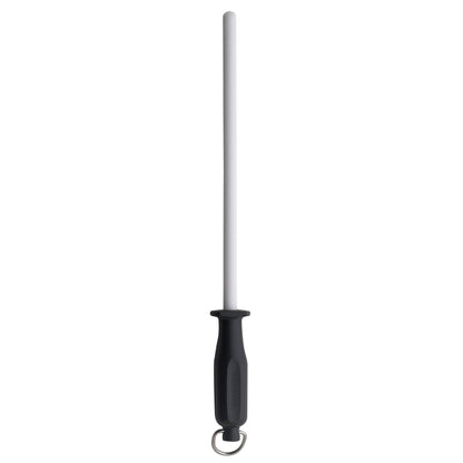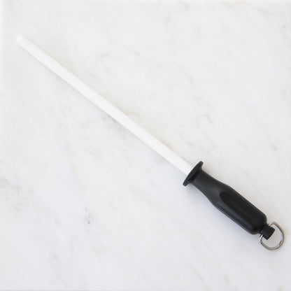 The Messermeister Ceramic Sharpening Rod has a fine 1200 grit ideal for maintaining the edge of knives, scissors and other cutting tools. It is engineered with a break-resistant solid ceramic core, large round sharpening surface, and an ergonomic handle with a hang ring. Hand wash with soap and water.