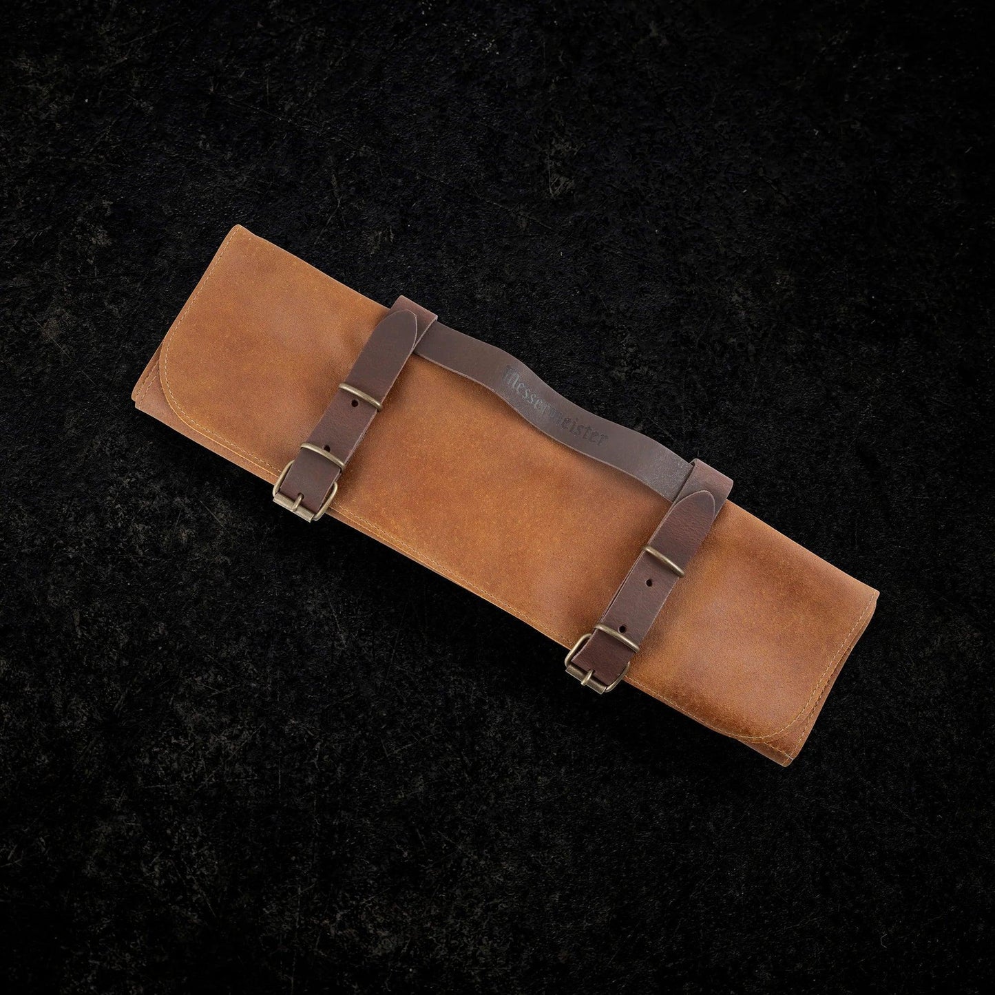 Messermeister's Amber Vintage Leather Knife Roll stores 7 knives with blades up to 10” long. The pockets inside are all a different size, which makes it possible to collect various sizes of knives. It is a unique item for professional chefs but also for knife lovers.