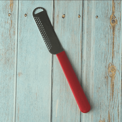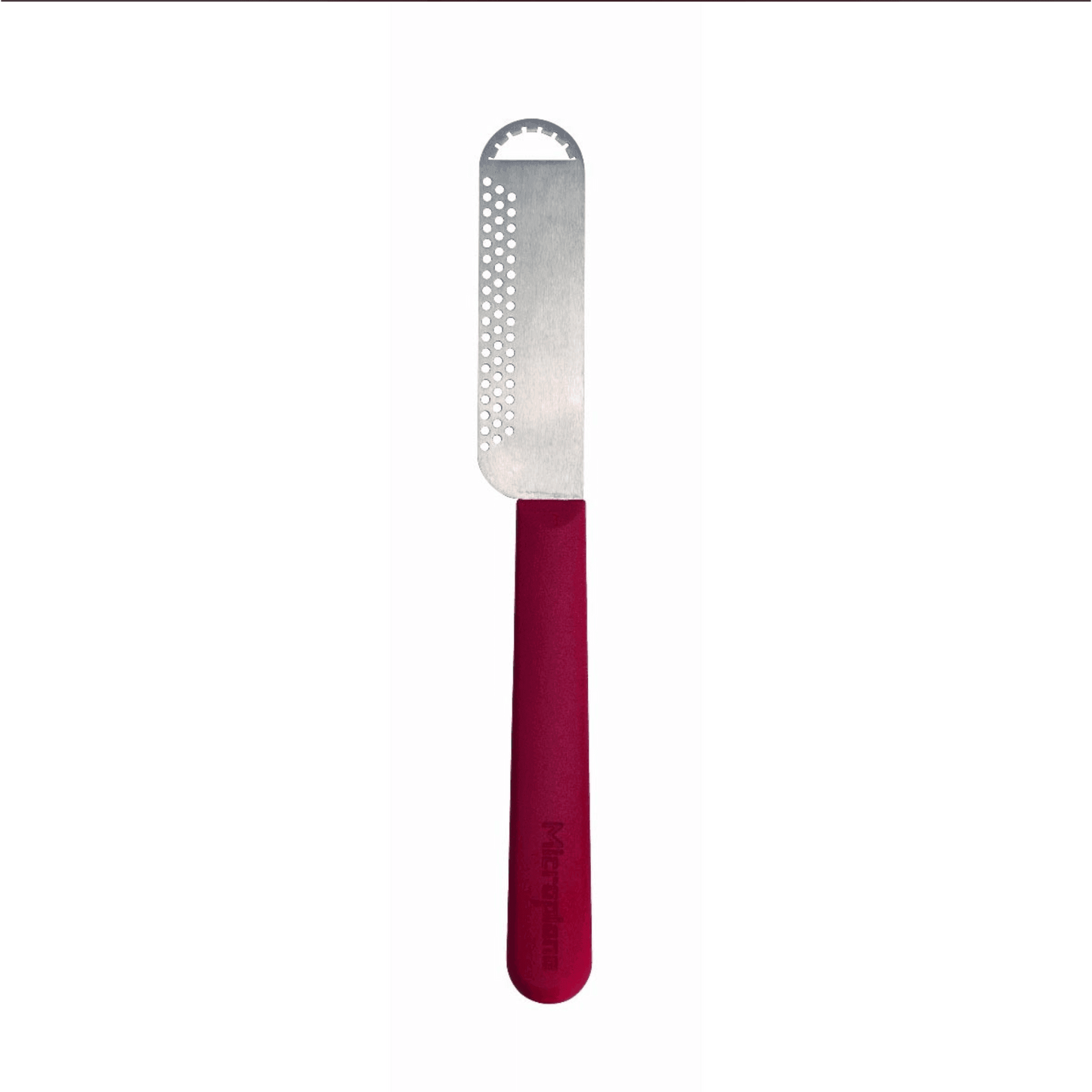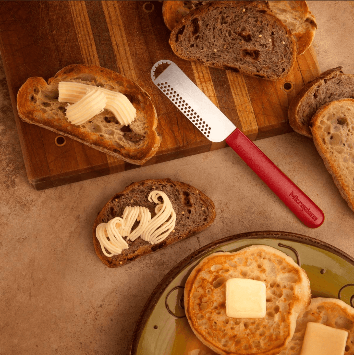 The Microplane Butter Blade is smartly engineered with a uniquely designed and shaped blade that makes using butter blissfully easy. The topside of the Butter Blade cleanly slices pats of butter and easily cuts through paper wrapping with printed measurements for accurate cooking and baking. The bottom side of the Butter Blade features three rows of tiny holes that when pulled across a stick of butter, create soft strands that warm up rapidly to flawlessly spread on soft bread, toast, muffins, scones, corn on the cob, and more. The rounded tip of the Butter Blade has an ingeniously crafted, hollow semi-circle to instantly create attractive curls by simply pulling the tip across a stick of butter. A new and efficient addition to anyone’s drawer of table knives, the dishwasher-safe Butter Blade can also be used on cream cheese.