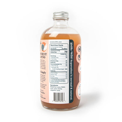 This premium cocktail mixer or elixir is handcrafted with vibrant grapefruit, zesty lime, a touch of honey, and a dash of spicy jalapeño. No artificial additives – just all-natural, clean ingredients.