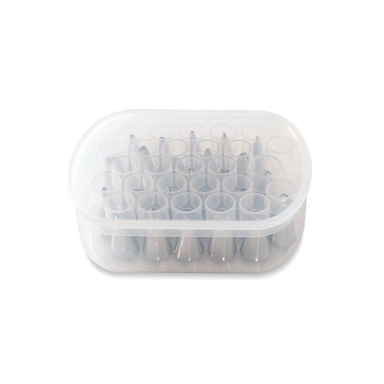 Frost cakes like a professional with 26 different stainless steel decorating tips and 1 coupler. Includes coupler that fits standard icing bags. Decorating ideas for every occasion— from classic stars to beautiful flower patterns. Keep tips organized in a handy storage box.
