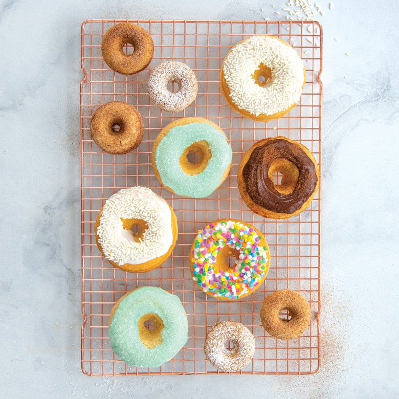 A delicious, homemade version of your favorite bakery treat- no frying necessary! Our Classic Donut Pan makes 6 baked donuts. Fun party dessert idea for any occasion such as birthdays, weddings, and showers. This Classic Donut Pan comes in two beautiful exterior colors, Twilight Blue and Poppy Red, paired with a premium nonstick silver interior. Proudly made in the USA.