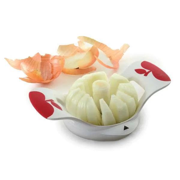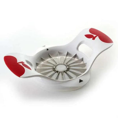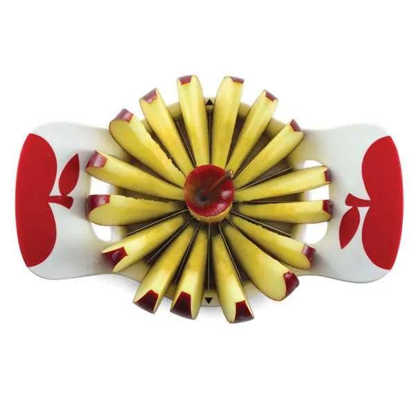 Cores and slices into sixteen even sections in one easy motion. Push plate pushes fruit up and out and protects blades when stored together.