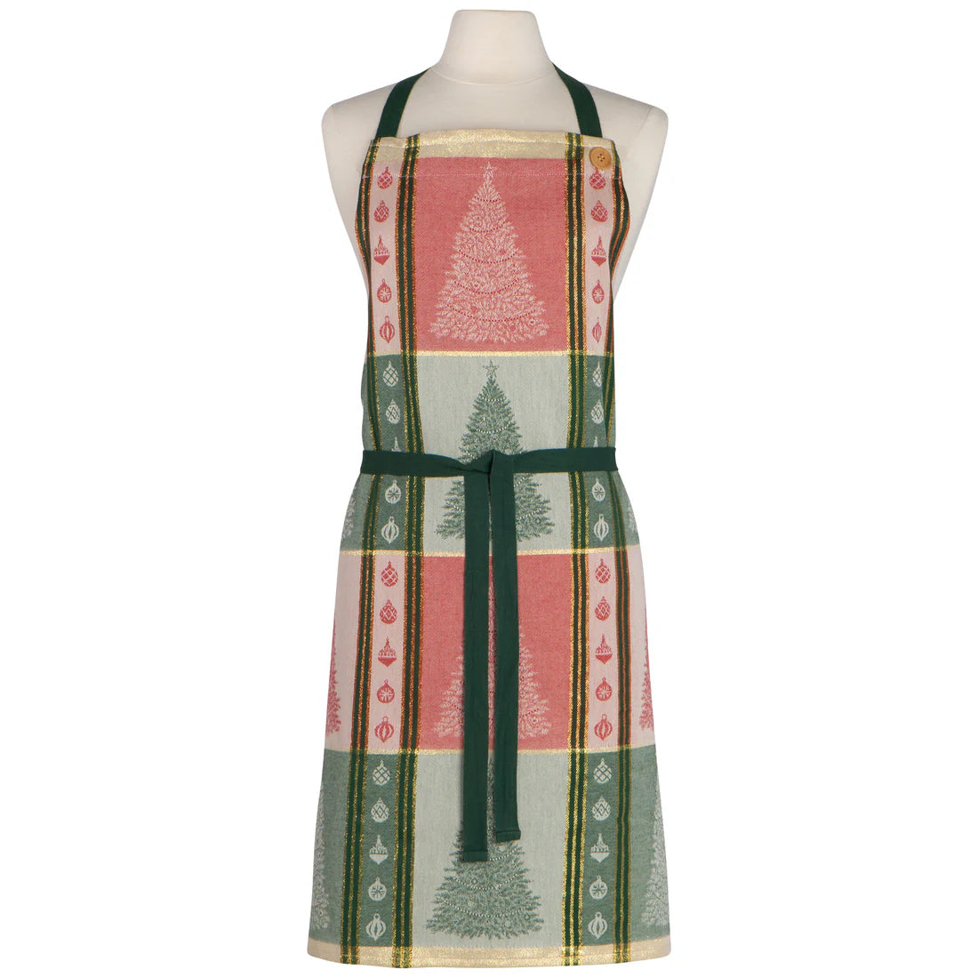 The Festive Fir soft cotton Jacquard apron is paired with extra long waist ties and a wooden button closure for function and charm. Vintage-inspired ornaments shine on refined shades of red, fresh forest green, and glimmers of gold—this design celebrates the centerpiece of Christmas celebrations.