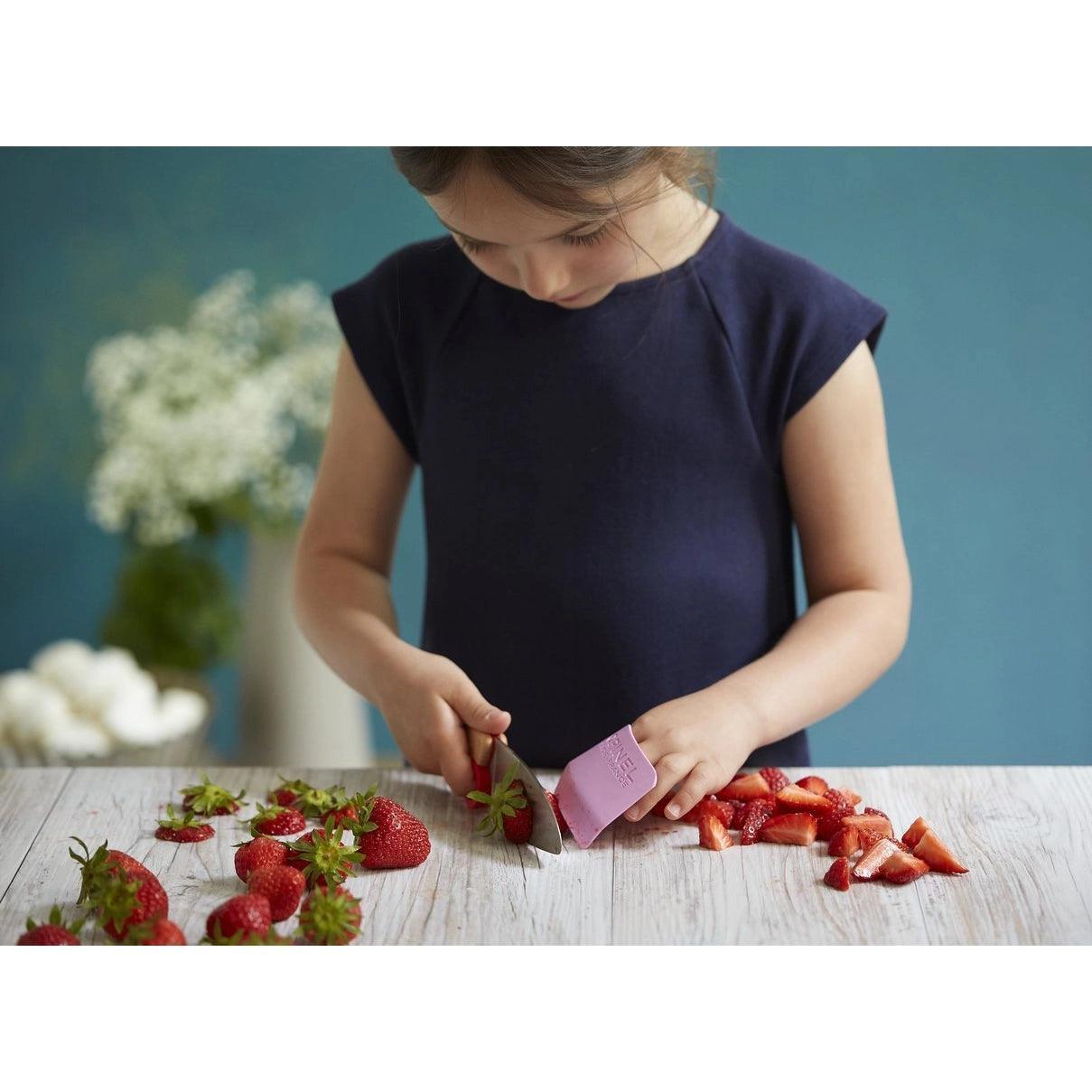 Le Petit Chef collection is ideal for teaching children how to cook safely. This set includes a finger guard and a kitchen knife with a rounded tip & educational ring to help position the fingers and prevent the hand from slipping onto the blade. Both the knife and the peeler have stainless steel blades, requiring no maintenance at all. Please note that this knife is sharp and young users should be supervised at all time.