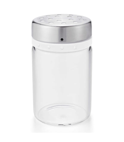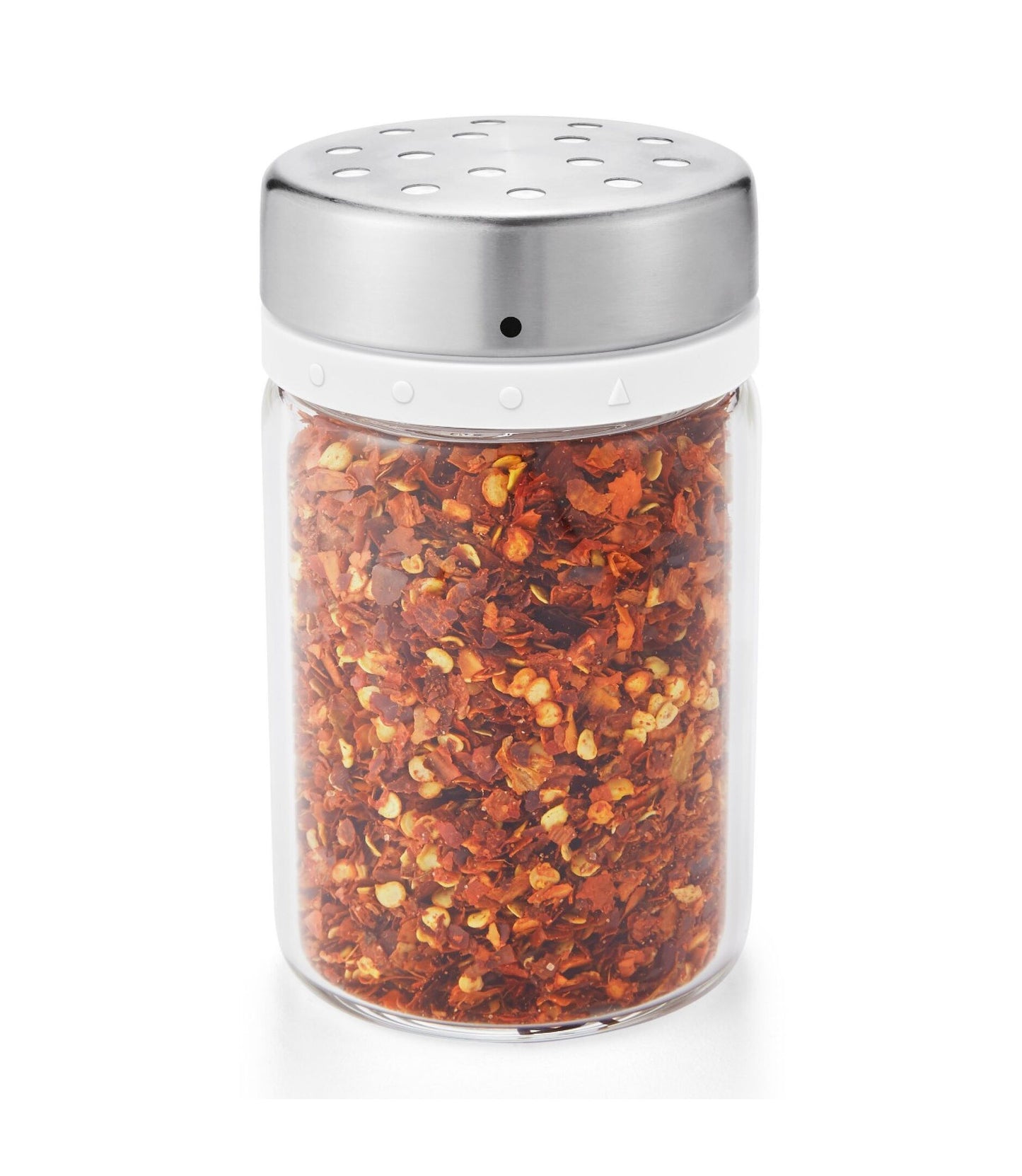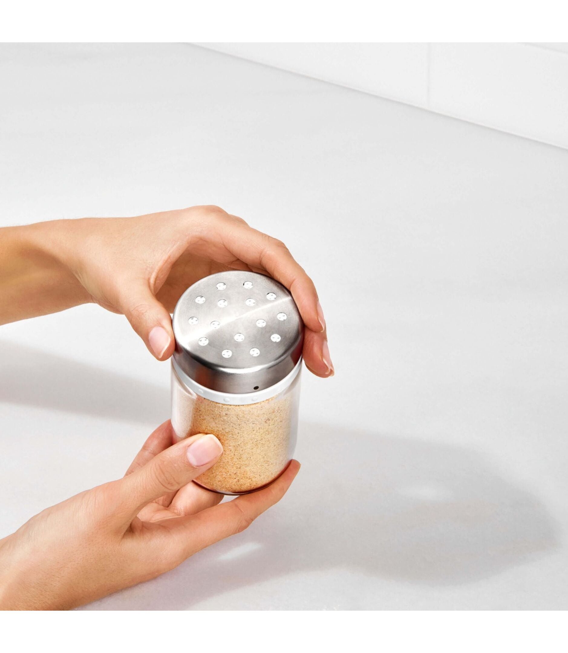 This shaker does it all, from red pepper flakes on pizza to powdered sugar on pancakes. Just twist the stainless steel top to choose between large holes for coarse ingredients like herbs and spice rubs and small holes for garlic powder, cinnamon and more. Twist once more to close the shaker for freshness. The sleek design looks great on the table while dining. When you're done eating, the stainless steel top removes for easy cleaning. The bottom of the shaker is dishwasher safe.