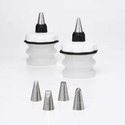 Decorating pastries is easy and fun with our Decorating Bottle Kit. Set includes six durable, stainless steel tips: Small Round, Large Round, Open Star, Closed Star, Basket and Leaf Tip. Bottles hold up to 4 oz of icing each and fit most standard stainless steel icing tips.