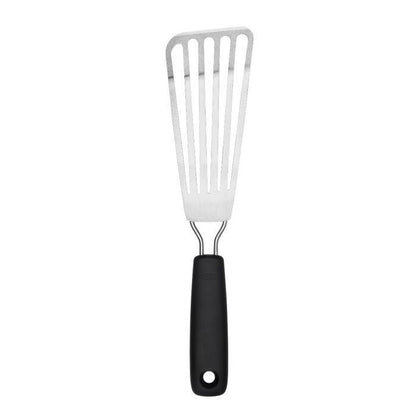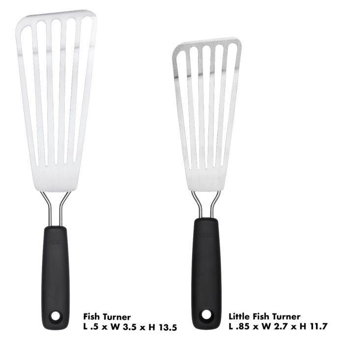Use this handy Fish Turner when cooking whole fish, seafood cakes and more. The beveled edge slides easily beneath foods and the slots in the head allow grease to drain. The durable, stainless steel head confidently flips whole filets and the soft handle allows for a comfortable grip.