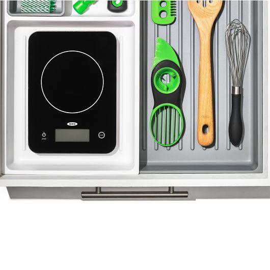 Achieving precise measurements whether cooking, baking or portioning out meals, just got easier with the OXO Good Grips 11 lb/5kg Everyday Glass Food Scale. We gave this digital glass scale a slim design so it takes up less work space, while still giving it all the bell and whistles needed to give you accurate results. The tare function makes zeroing out ingredients a snap, so you can feel confident as you work your way through a recipe. We also made sure to include easy universal unit conversion (oz/lb/g/kg/ml) and a large, backlit display for easy reading. Four AA batteries included.