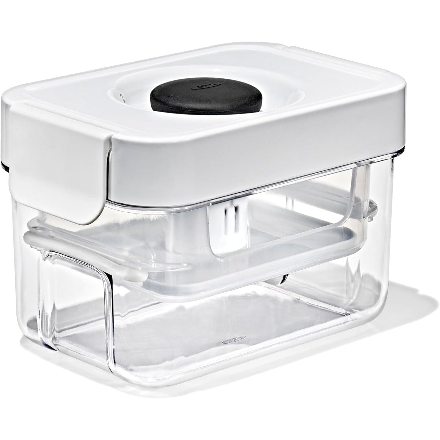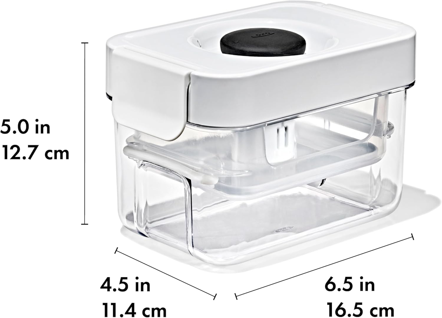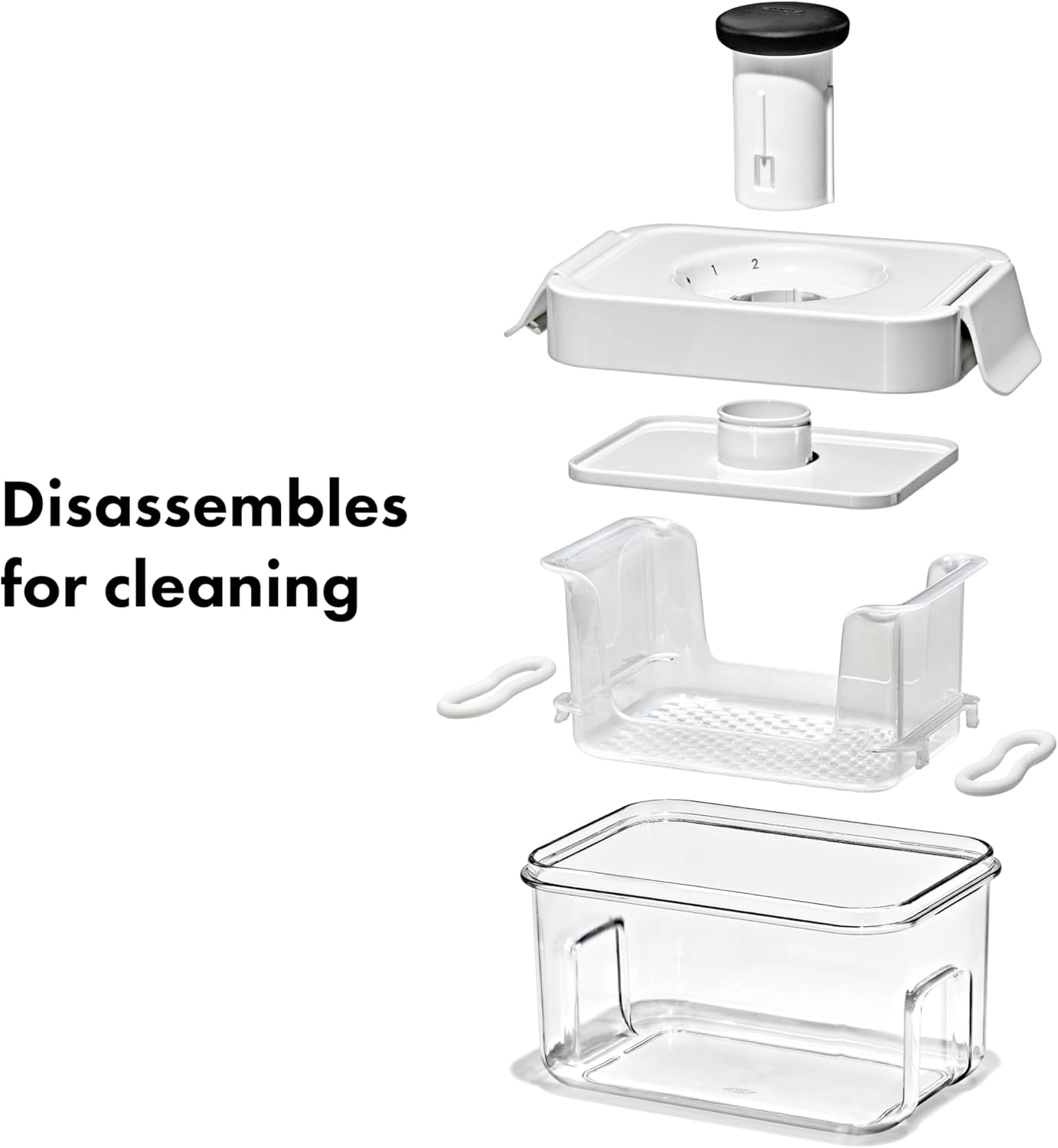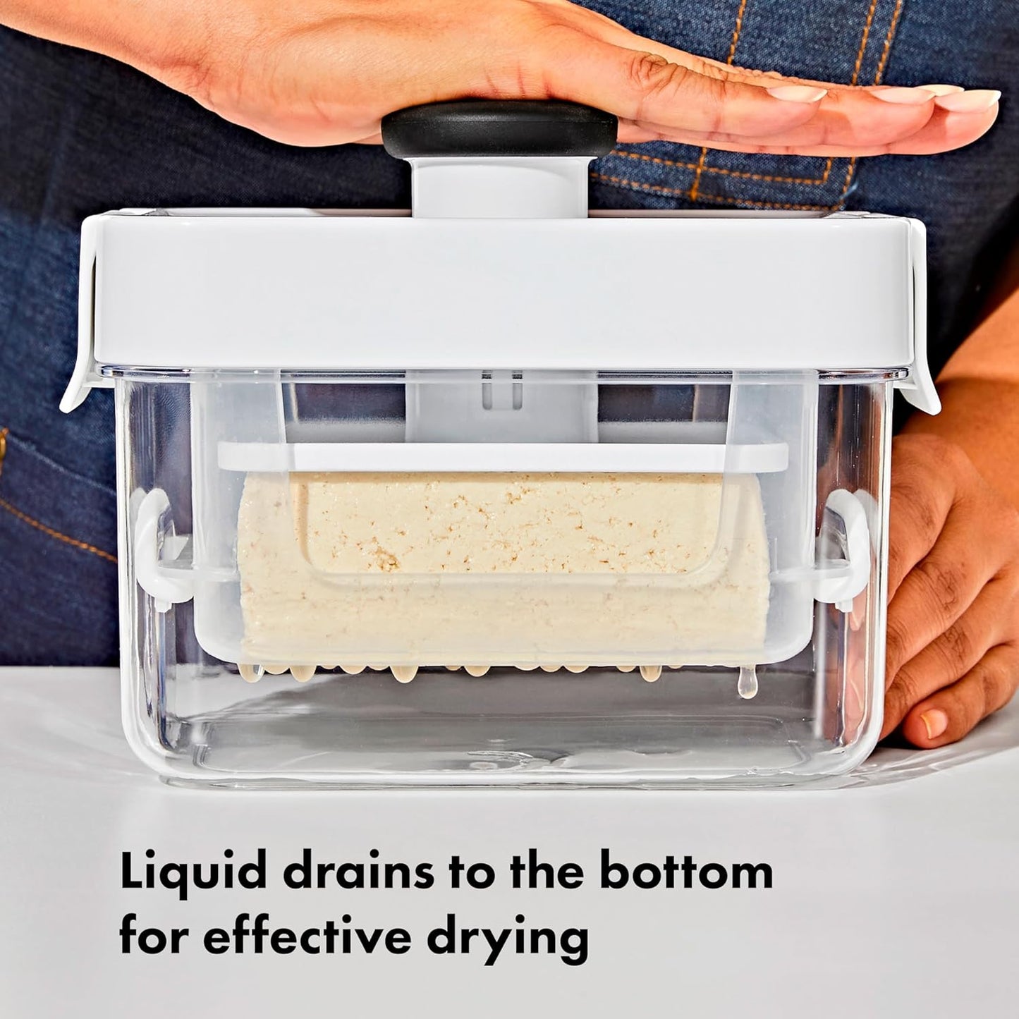 - Clear body contains water to prevent mess during meal prep and holds pressed tofu above extracted water