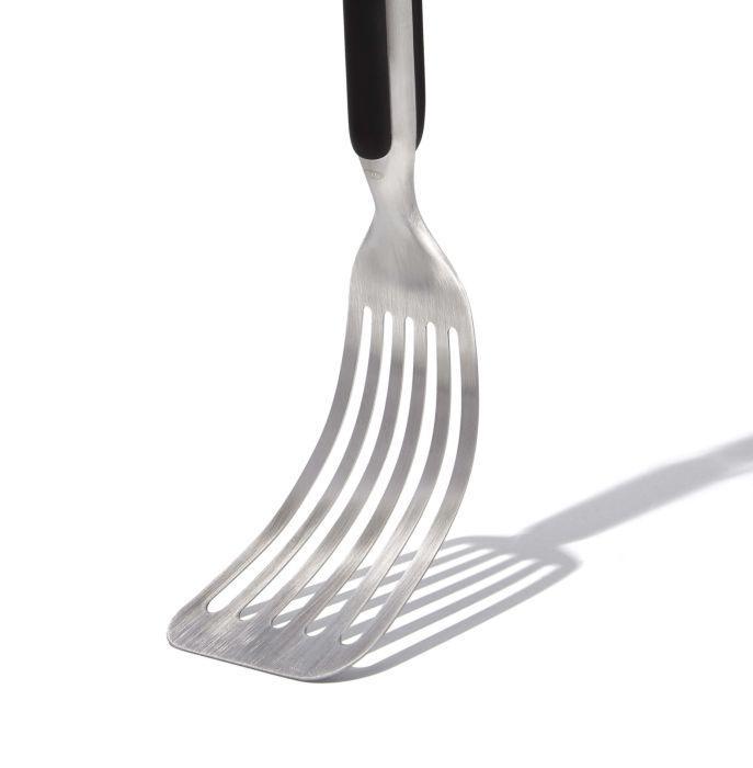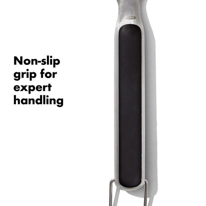 The OXO Good Grips Grilling Precision Turner may look a lot like a fish spatula, and at its core, it is. But we’ve given it a different name because it’s good for so much more. Yes, the thin, beveled edge can slide seamlessly under the flakiest fillet. But the bendy, stainless steel head is also sturdy enough to hold the thickest pork chop. And with a comfortable, non-slip grip, plus a convenient hanging ring for grill-side storage, this spatula has it all. Dishwasher safe.