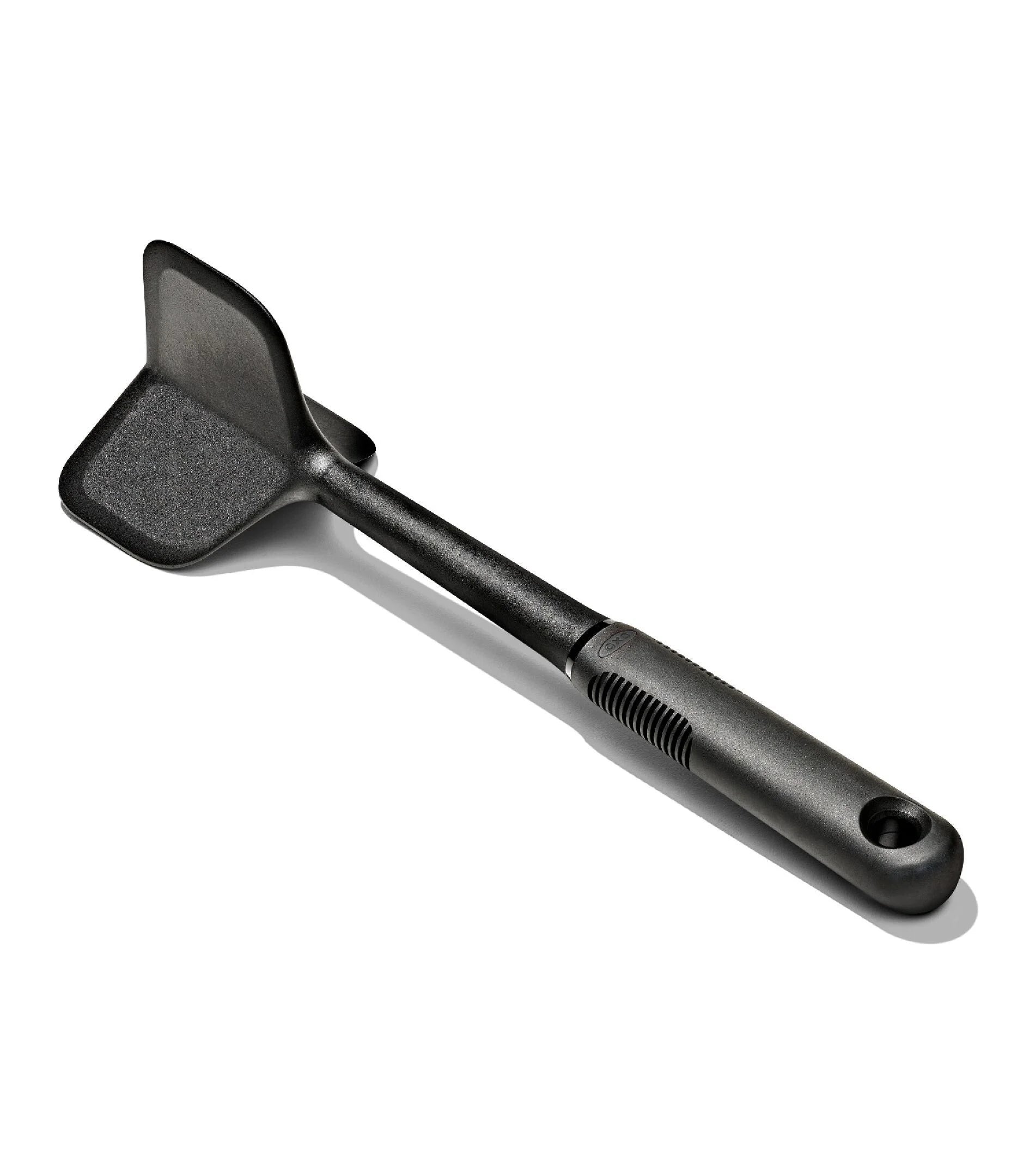 The Ground Meat Chopper & Turner's three wide blades help you stir without getting meat stuck in between. Silicone edge is great for scraping and transferring food out of pans. Rounded design helps you scrape corners of saucepans. Heat resistant up to 400° F.