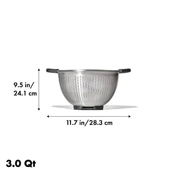 Whether you’re rinsing veggies or straining pasta, the OXO Good Grips 3-Qt Stainless Steel Colander is ready for the job. Elevated, non-slip handles provide a firm and comfortable grip, even when handling large batches. This colander is constructed with three feet at the base that deliver stability in the sink and on the countertop and nest neatly in mixing bowls for convenient straining and storage. The perforated design ensures fast and thorough straining. Also available in 5-qt size.